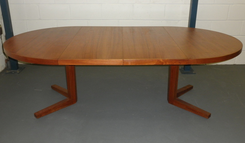 Whilst illustrating the designer’s robust style, the table has a totally original and nicely patterned teak veneered surface with minimal, barely noticeable, colour variation and extends from a conveniently sized circle and the two additional leaves make an extremely large oval easily seating up to 12 people.