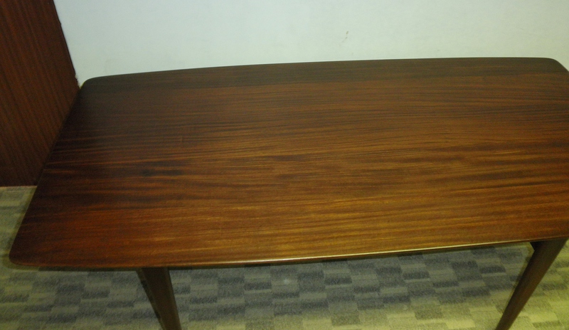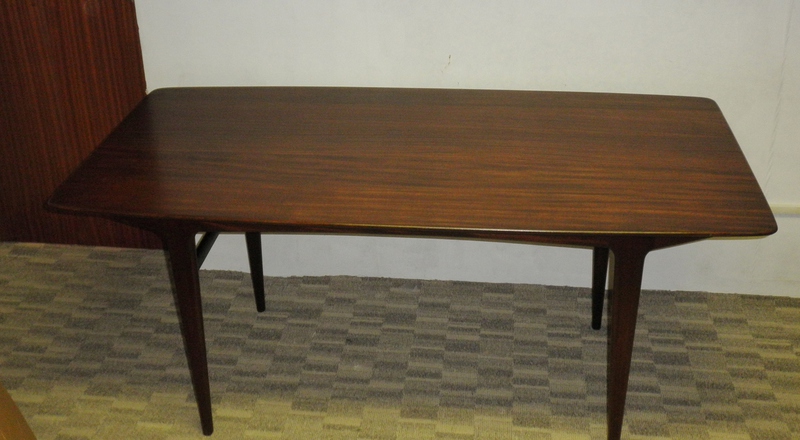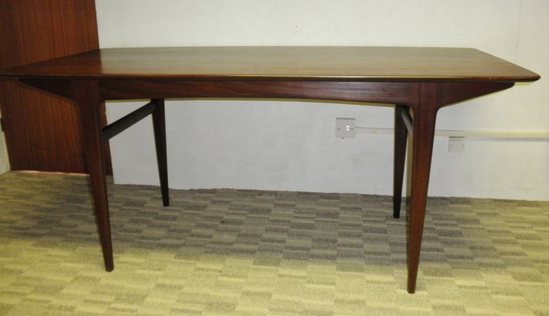 Dating from the 1960s and in the Danish style, this solid mahogany dining table (in a similar style to Ercol’s plank table) designed by J Herbert for A Younger Ltd, known for their high-end fine quality furniture, this table was from one of their most popular 1960s ranges, Moselle. The beautiful rectangular dining table has a slightly tapering shaped top, raised on turned legs, constructed in Tola wood (West African mahogany) producing elegant clean, minimalist lines and is a rare find in such superb original condition.