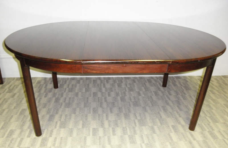 Bearing the Danish Furniture Control label, this large circular dining table with a deep apron and extending single leaf to create an attractive oval, raised on detachable round legs and produced using a nicely figured, dark hardwood, possibly mahogany but resembling some rosewood-like figuring.