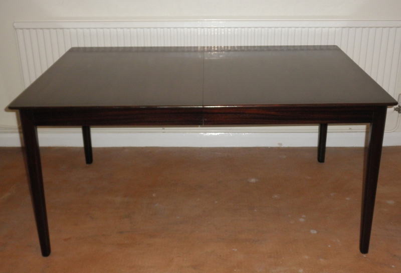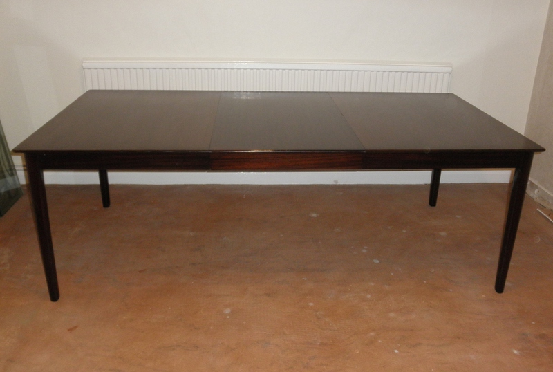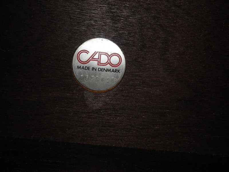 Mid-20th century Danish mahogany extending table made by Cado and bearing the brand button on both the table and the extension leaf – the latter having the same deep apron as the table itself and has a very tiny loss of veneer (see photos) on a leading edge where it meets the table.