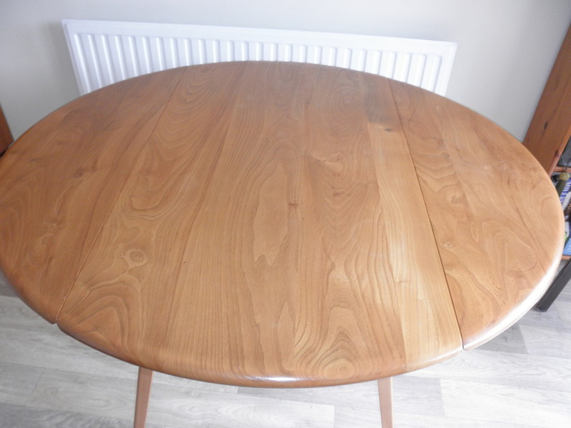 Raised on splayed tapering beech legs with a solid elm top (designed to seat 6 people) converts from an oblong to the circular / oval by means of the two semi-circular leaves supported by sturdy pull-out metal rods and beech blocks.