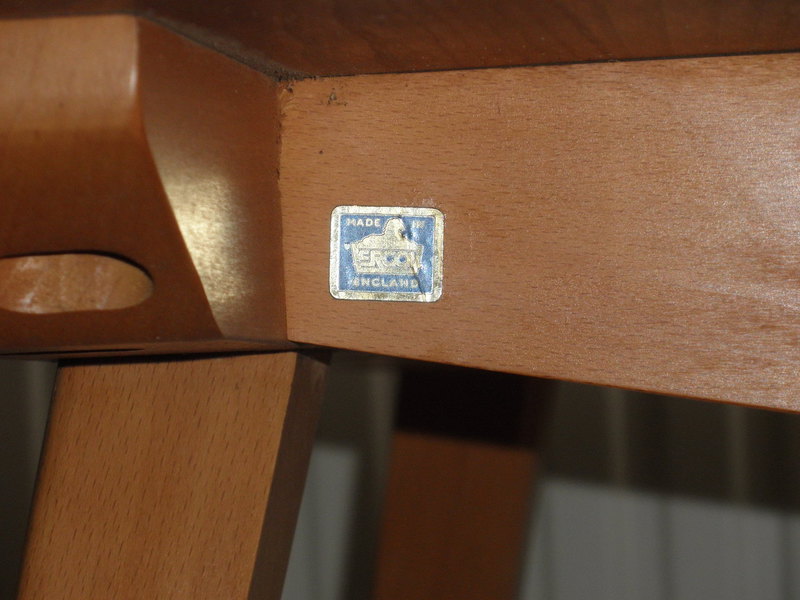 A labelled, drop-leaf dining table in Ercol’s natural finish