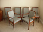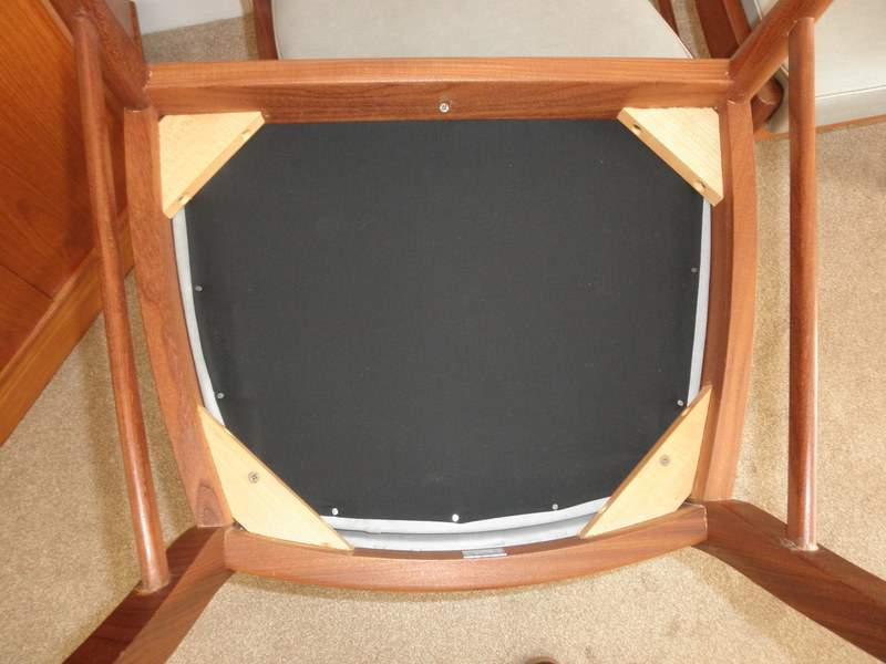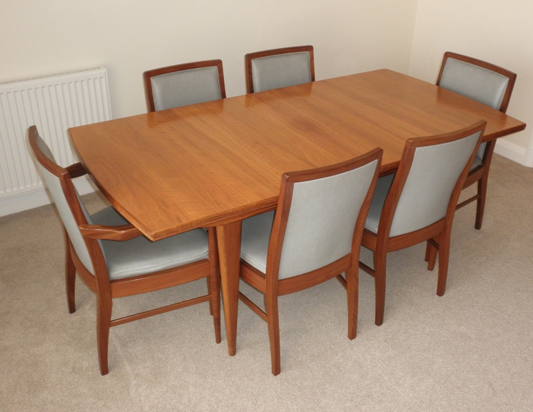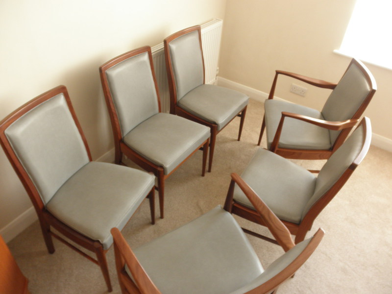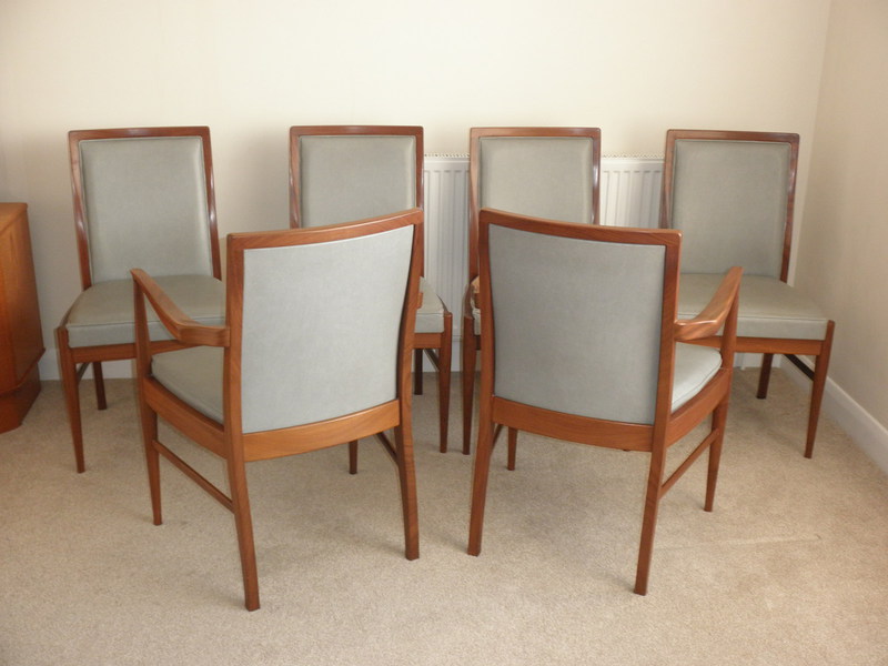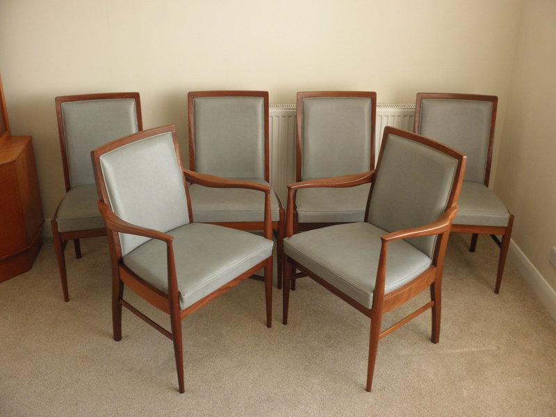 The labelled four dining chairs and two carvers are in exceptional condition, made from sturdy afromosia and with the very smart light grey vinyl would complement the popular present-day contemporary interior decorative colour scheme – all chairs are in superb, sturdy condition with no loose joints or signs of wear.