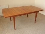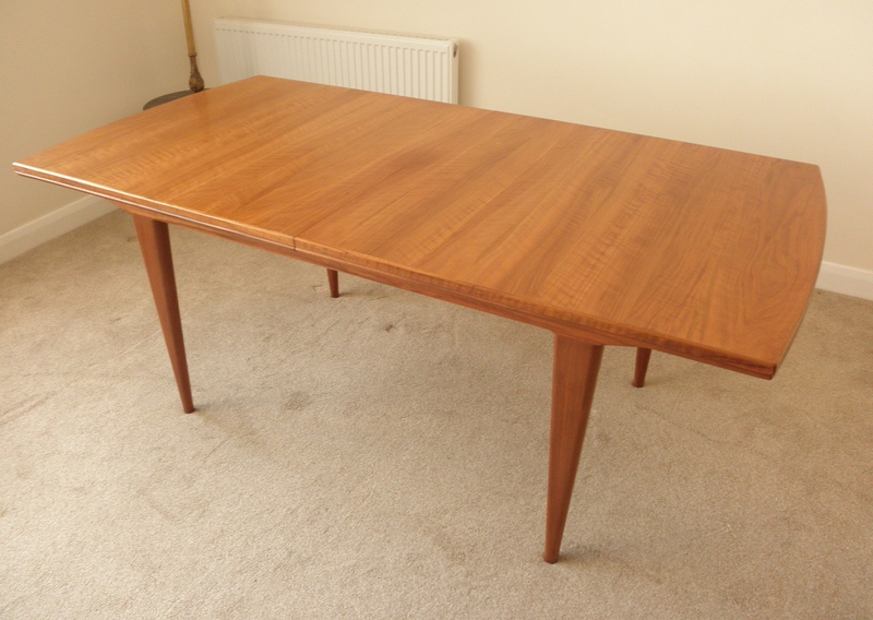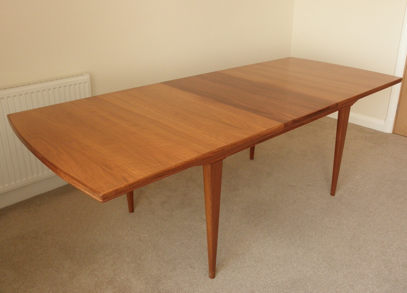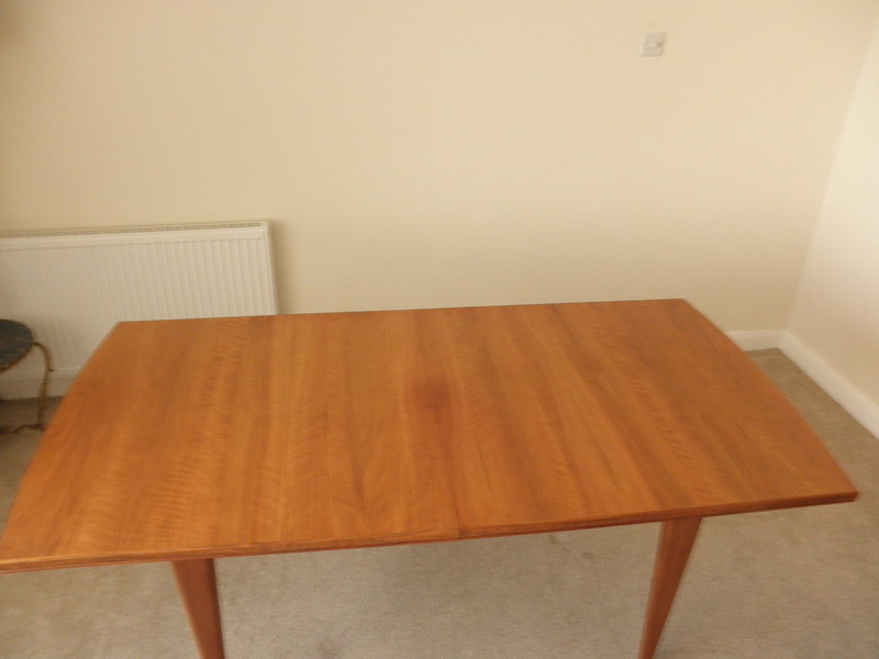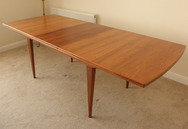 Raised on tapering legs, the very large table has gently curved ends and extends by way of a folding leaf that sits within the table and show very minor variation in colour to the two main leaves – all with a very attractive pattern in the walnut veneer with only minor fading.