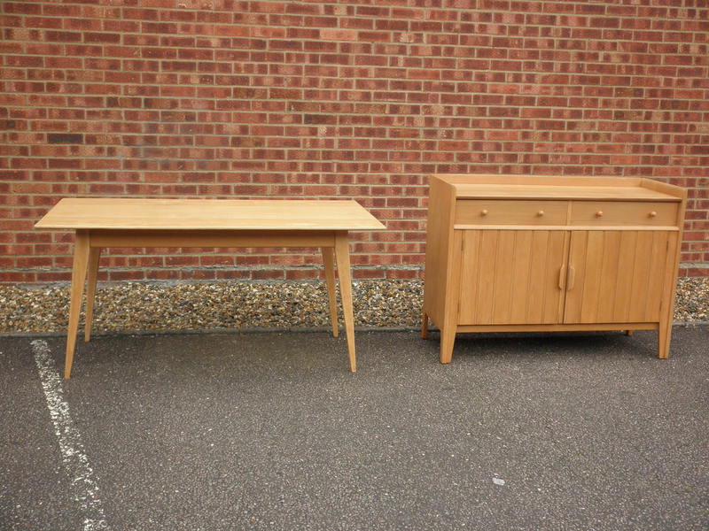 Reputedly a dining set from the 1951 Festival of Great Britain, this dining table and sideboard certainly has similar elements to those of other items exhibited by Ercol and Heals. The elegant and fairly long table has slightly angled legs which are very like Lucien Ercolani’s early designs and the sideboard (see reference below) is a similar style to those of Gordon Russell and Christopher Heal.