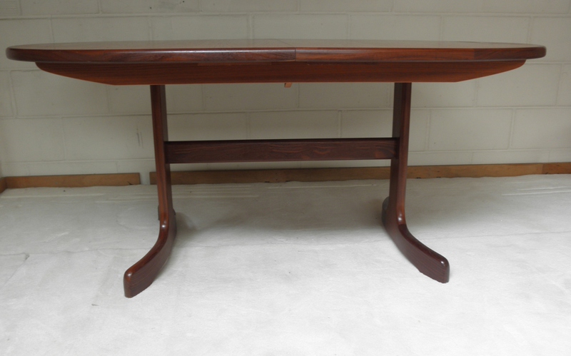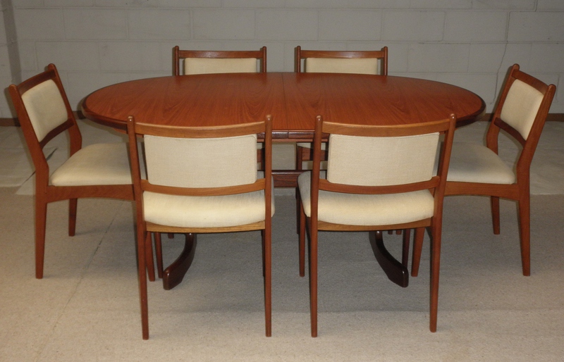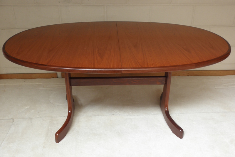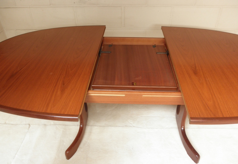 From the mid-1970s, this G Plan Fresco range extending oval dining table designed by Victor B Wilkins – Model 4388D in the Danish style, has a teak veneer top banded with contrasting afromosia on an elegant refectory base, also in beautifully patterned solid afromosia. Designed to easily fit dining chairs around the beautifully curved legs to comfortably seat 6 – 8 people when fully extended by the flip-action / butterfly leaf.