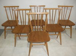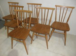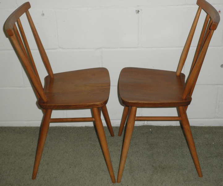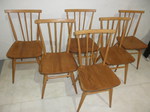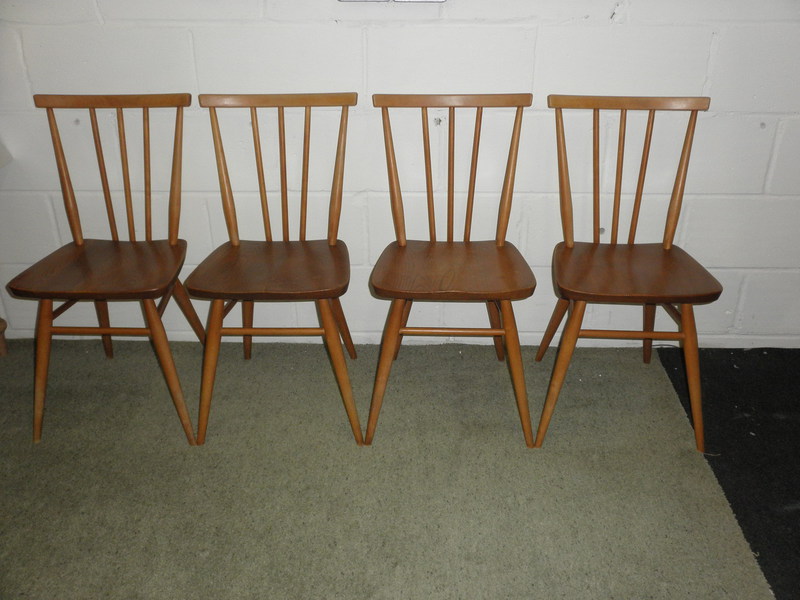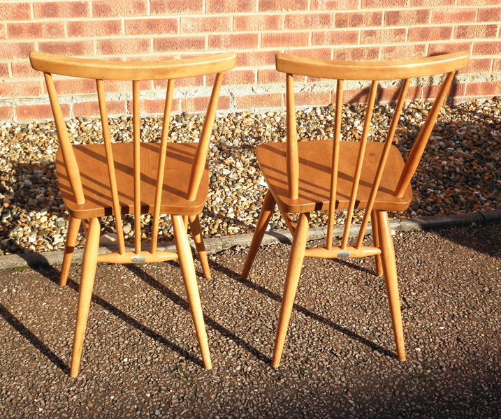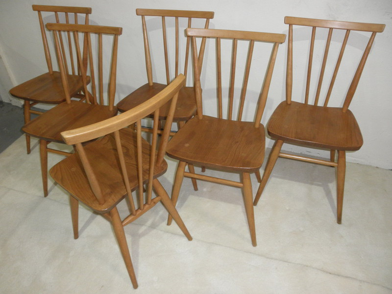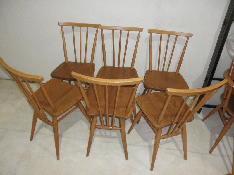 Appearing in the Windsor range of Ercol’s 1956 catalogue, these six chairs have a beech frame and a curved top back rail from which 2 tapering columns pierce the solid elm ‘oyster’ shaped seat and 3 central turned spindles continue on down to connect with the back stretcher rail. This design can be seen repeated in the Ercol Kitchen Chairs that have a higher back rest and both styles proved very successful and continue in popularity today.