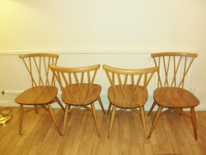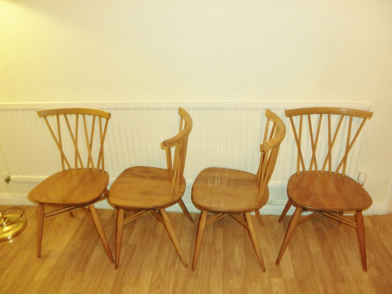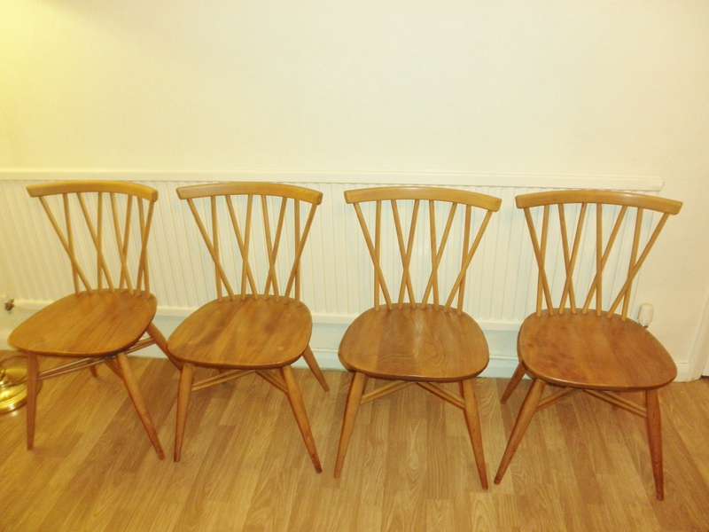 Appearing in Ercol’s 1956 catalogue, these original Model 376 lattice back (often called Candlestick) dining chairs are the early design featuring the double crossed stretcher close to the solid elm ‘oyster’ shaped seat. [Later versions of this style have an ‘H’ framed stretcher.]