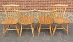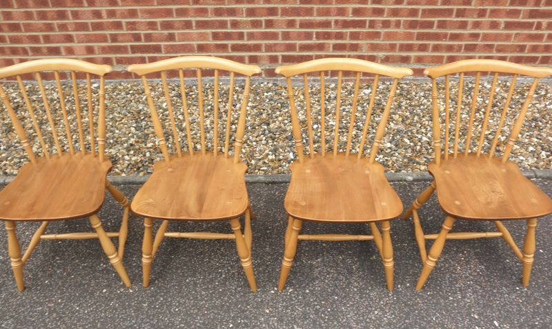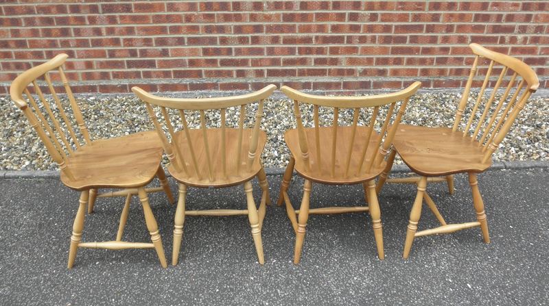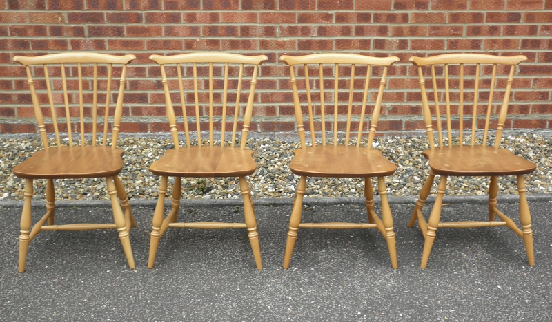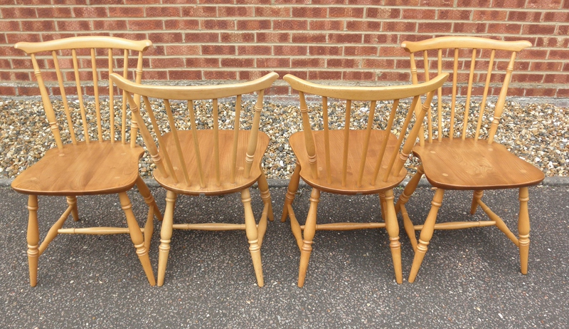 A set of four dining chairs, listed in the 1978 Ercol Catalogue as Model 714, Fan-Back dining chairs in Ercol’s beautiful Natural finish. The beech frames comprise 2 turned spindles flanking 5 plain central spindles below a shaped and gently curving back rail, with an ‘H’ stretcher between turned and outward splayed legs supporting the generously shaped elm seat. Being in incredibly pristine, original condition these vintage style chairs are a refreshing alternative to the more commonly found Ercol styles.